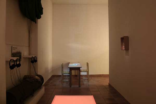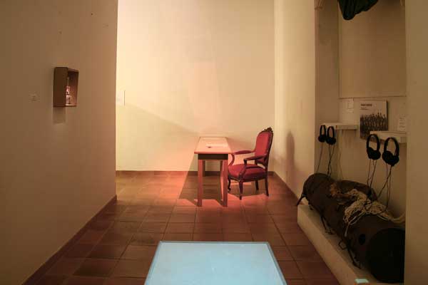 - Guerre : 1 table, 1 fauteuil velours rouge, lumière rouge, texte et stylo