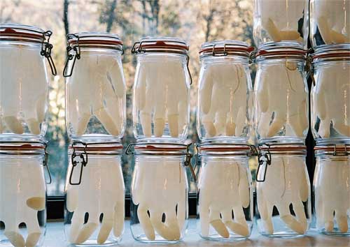 Seize bocaux de conserve, gants en latex naturel, ficelle, 18 cm, ø 10 cm le bocal