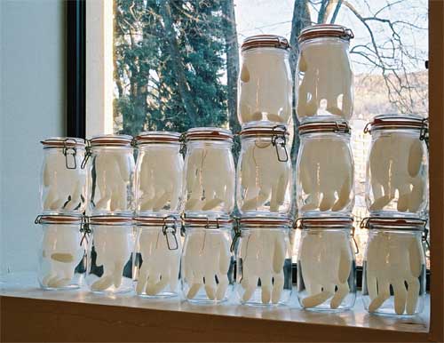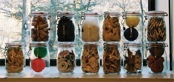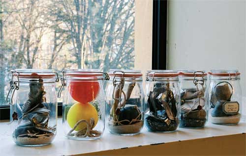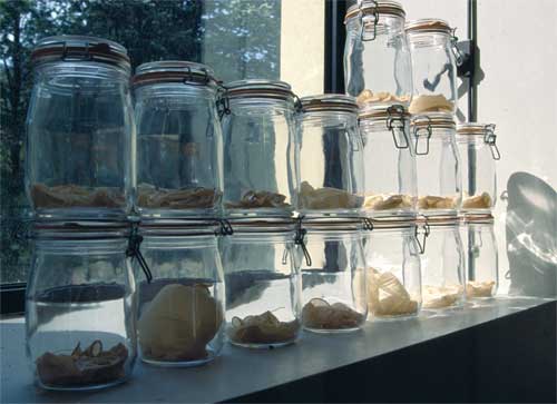 Collecter dans la nature des matériaux, végétaux, industriels, soumis aux éléments, eau, vent, feu, chargés d'histoires, de souvenirs, d'empreintes... Nul besoin de compliquer le geste de l'artiste, je le recherche simple, primaire, premier. Celui de notre ancêtre qui créa, en composant deux éléments, la première œuvre de l'esprit. Ces matériaux, simplement assemblés, simplement conservés, simplement installés, sécrètent de nouvelles histoires. Certains, sont enfermés dans un BOCAL en verre, hermétiquement clos, scellé à la cire, à l'égal de nos conserves de campagne. L'Objet devient relique, “Reliques“ d'une époque pour un futur très lointain. Plus de contact avec celui-ci, une autre histoire commence. L'acte de création ne commence-t-il pas par un geste d'appropriation ?