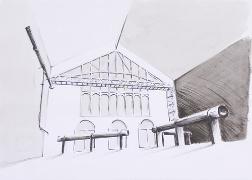 Croquis de recherche, encre de chine sur papier, 50 x 65 cm. Etude des tubes et des ressorts de résonance, 2006. |