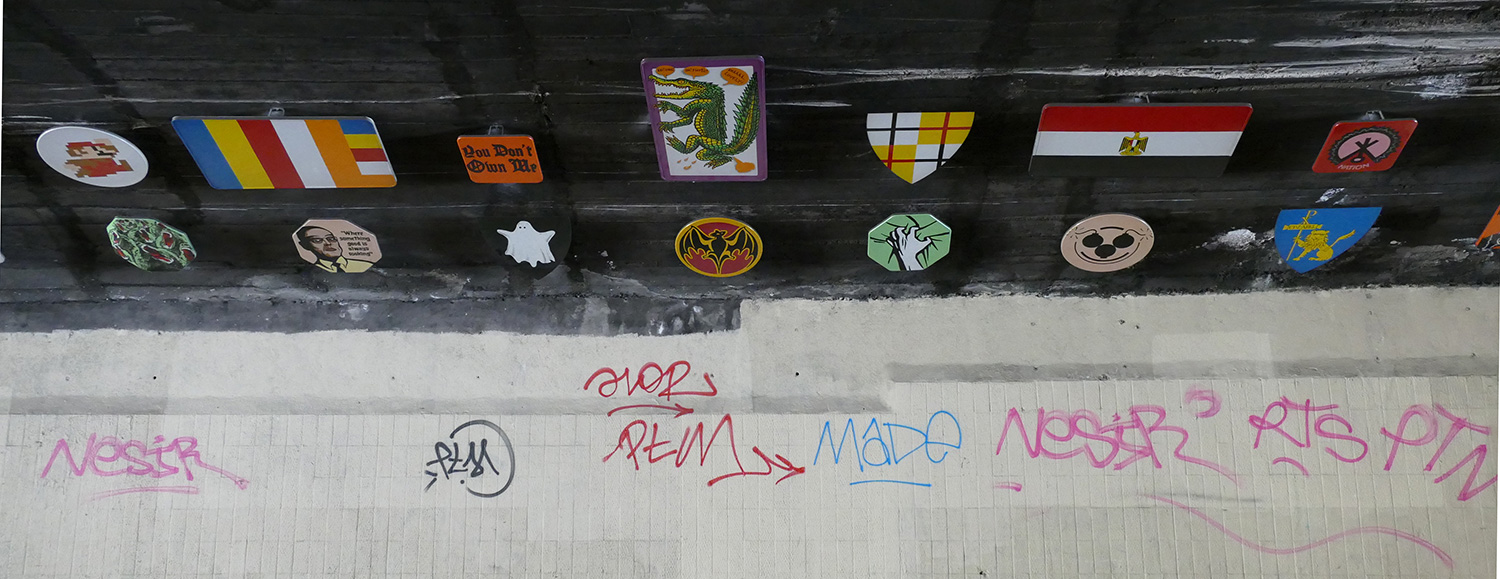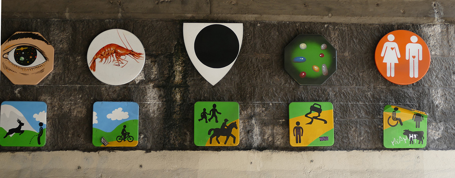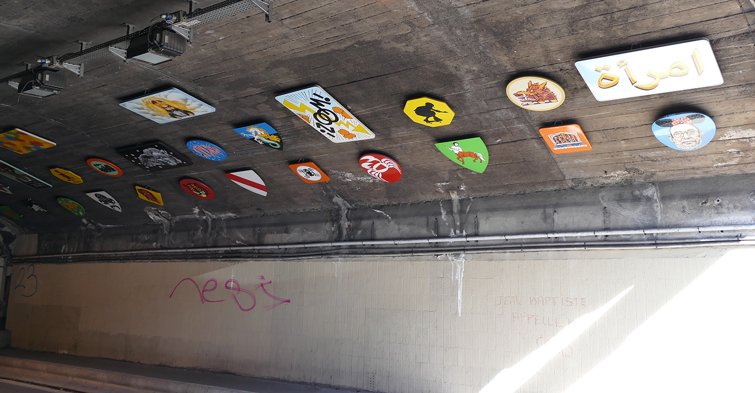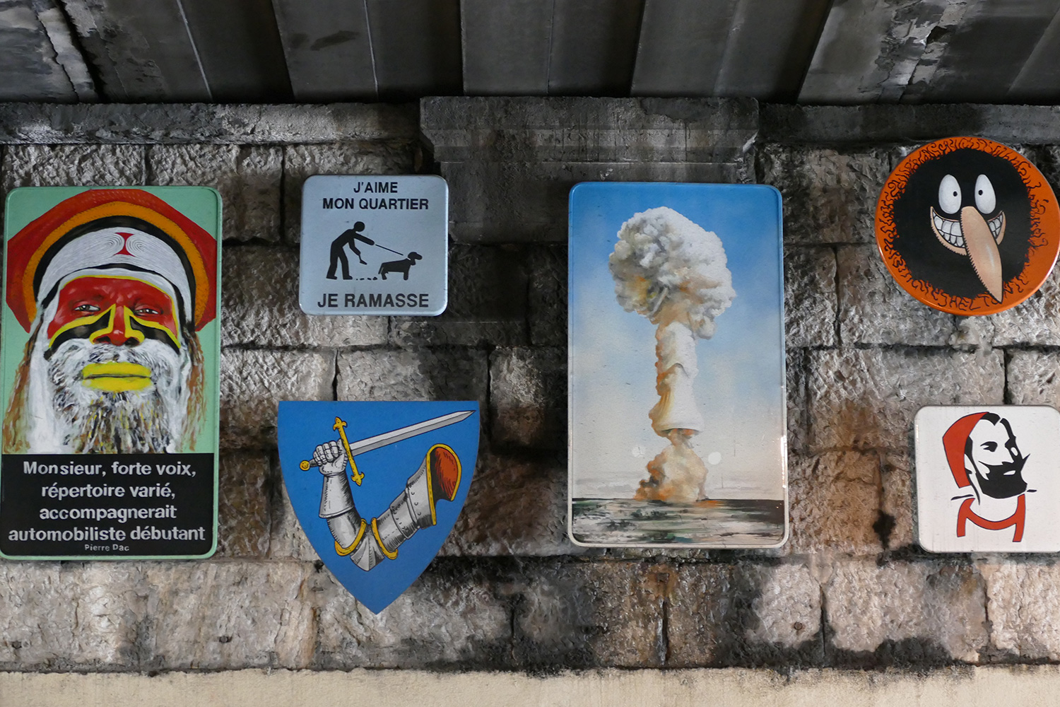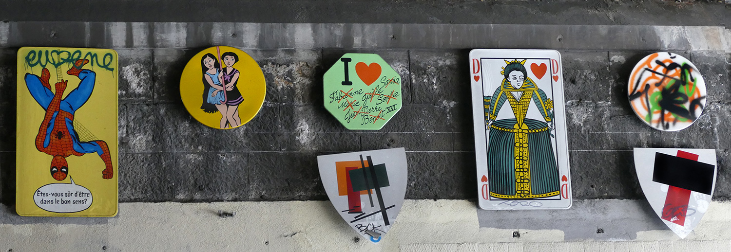 À partir de son travail iconographique qui mixe très souvent signes, symboles, images indexées à l'histoire aussi bien que ceux de la bande dessinée, le graffiti, tatouages, logos tribaux, l'artiste Frédéric Clavère propose d'installer un ensemble de panneaux peints, à la manière d'une caverne de hiéroglyphes d'un genre nouveau. Une mosaïque de pictogrammes issus de son imaginaire et de celui des habitants ou usagers du quartier.