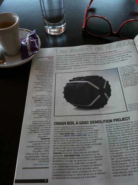 Le numéro d’été du mensuel culturel Zibeline fait un point sur le projet Crash Box en page 5 de l’insert spécial "Les Ateliers de l’EuroMéditerranée". Ce numéro 43 est disponible gratuitement du 13/07/11 au 14/09/11 aux points de diffusion habituels.