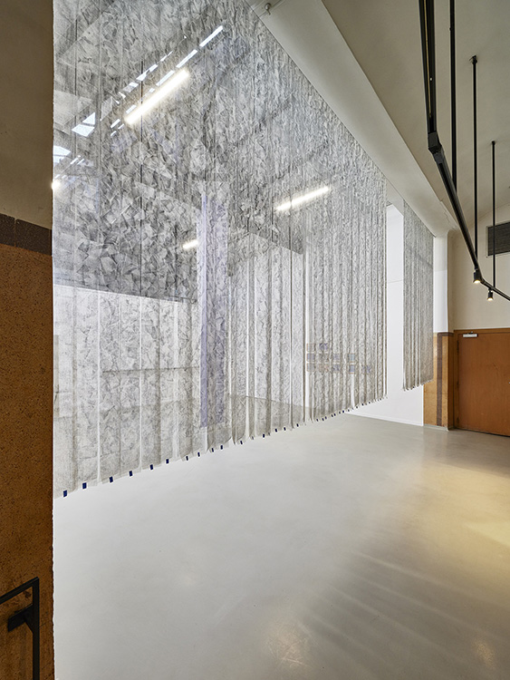 Depuis la bouche d’aération de l’espace d’exposition, un son incertain comme l’arrimage d’une rumeur, grésille en boucle, propageant une onde acoustique aux tonalités à la fois harmoniques et distordues. L’artiste musicien Francois Marcelly-Fernandez, à l’invitation de Lina Jabbour, compose une œuvre panacoustique, intitulée : Jenfold Classic S du nom de la calandre, machine industrielle engageant et séchant le linge de la blanchisserie située à deux pas du 3 bis f. Miroir sonore du dessin suspendu Sismographie cosmique, François Marcelly-Fernandez a prélevé au sein de l’usine divers sons d’ambiances de la blanchisserie dont l’essentiel provient de l’intérieur de la calandre. Dans une