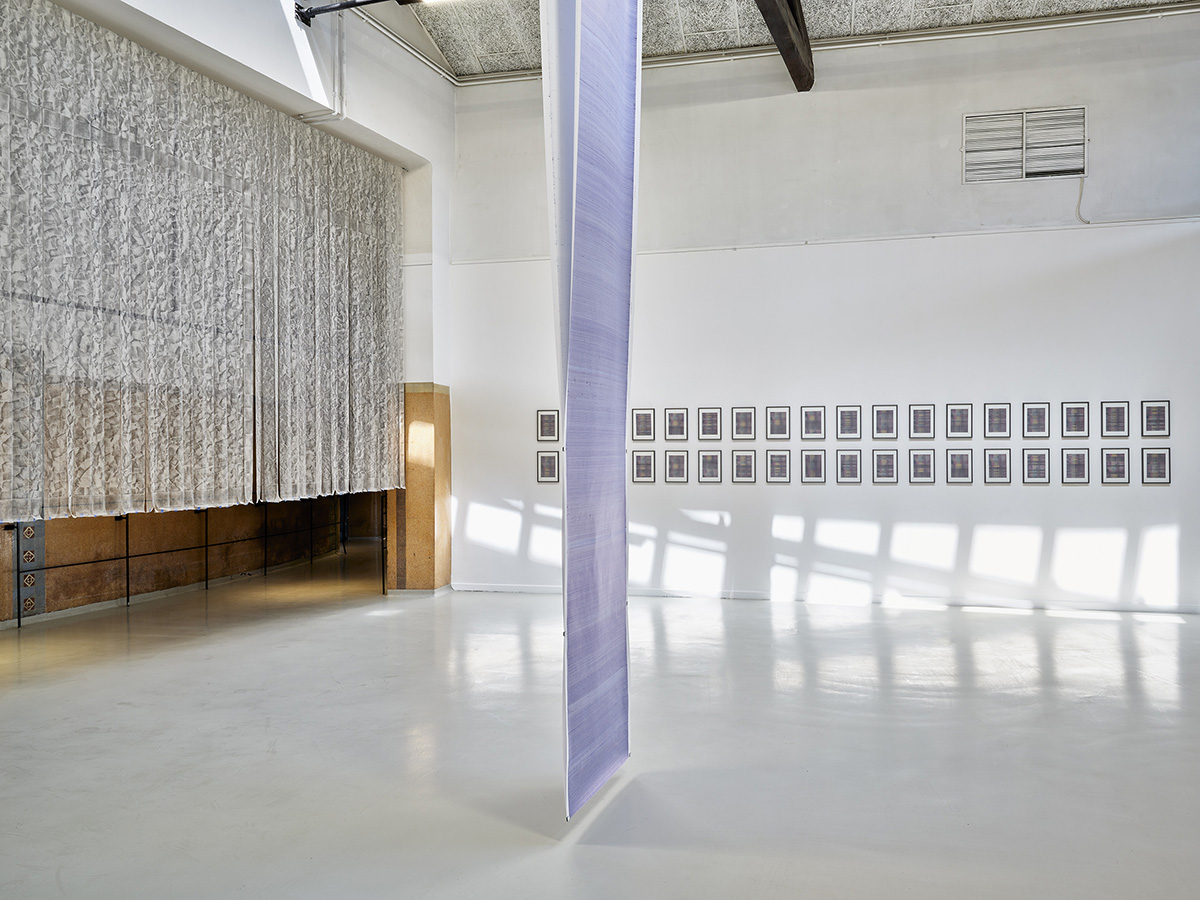 Suspendues en 73 bandes à l’entrée de l’espace, numérotées selon la classification d’un répertoire inhérent aux opus, l’empreinte du sol est hissée à la verticale, le sol diésé par cette bascule de 90 degrés devient une peau spectrale, telle une mue, dont l’exuvie fait apparaître son double incertain.