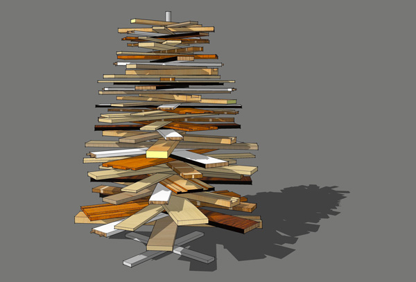 Bois et agglomérés provenant de meubles récupérés et découpés, cales en bois (lattes pivotantes), empiètement acier, 292 x 250 x 250 cm
