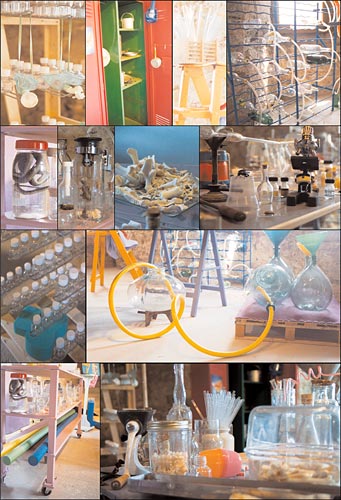 Deux caisses en bois montées sur roulettes augmentées d'éléments de chariots de transport, poignées, néons, plexis de couleur, récipients en verre, boîtes en carton, matériel électrique divers, bull-pack coloré |