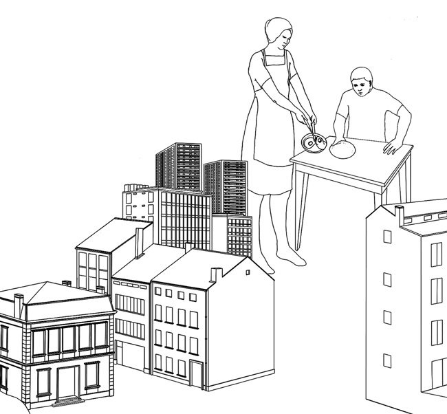 Cette vue qui se présente étymologiquement comme un tout oblitère trés souvent ce qui paradoxalement fait la ville, à savoir les habitants. Depuis un belvédère, on verra des bâtiments et la grille des rues à perte de vue, il sera cependant difficile de repérer les minuscules figures humaines qui habitent ces lieux.