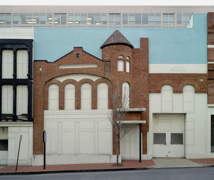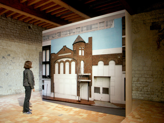 On y voit un exemple de façadisme photographié par l’artiste à Washington : engloutie par la construction d’un bâtiment sur son propre emplacement, une petite maison de briques a été réduite à sa seule façade sur la rue et forme une sorte de « bas-relief ». Bien que rendue aveugle, portes et fenêtres y apparaissent néanmoins sous forme de dessins. Plus élevé et peint de couleur bleue, le bâtiment construit derrière fabrique au-dessus d’elle une portion de ciel fictif. L’ambiguïté de l’image est troublante. Maquette ? Espace réel ? Construction numérique ? Les strates successives de l’espace - arrière-plan, bâti, façade, dessin- sont aplaties pour former la peau de cet objet, à la fois image et module. Ce double statut agit aussi dans notre rapport à la pièce. Trop petite pour être à l’échelle un (d’où l’impression de maquette), l’image est cependant de grande taille (3m10 de haut). Le bloc qu’elle forme avec la cimaise surplombe le spectateur et devient décor, comme une espèce de fond de scène. La présence du dessin sur la façade fait aussi écho à certaines interventions de Stéphanie Nava. Ainsi, sur une vitrine passée au blanc d’Espagne, L’élaboration des pièces (2004) lie travail et sommeil par le dessin de différents objets, outils probables d’une activité à l’intérieur de cet espace qui apparaît endormi. Mais alors que cette pièce travaille à rendre visible ce qui n’est pas immédiatement accessible, c’est la mise en scène des rapports de dissimulation et de confusion qui est à l’œuvre dans Wall Drawing.»
