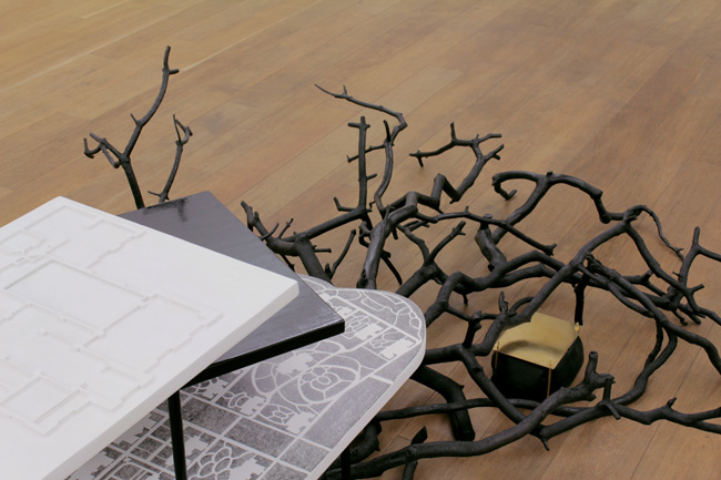 Branches calcinées, laiton, chambre à air, crayon et encre sur bois enduit, carton, caséine, métal laqué, 190 x 150 x 56 cm