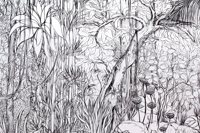 Ce dessin mural occupe l’espace dans lequel il est installé selon un protocole simple qui est de chaque fois recouvrir un mur dans son entièreté: du sol au plafond, d’un angle à l’autre. Réalisé directement au fusain sur la paroi sans suivre ni projection ni dessin préparatoire, il se transforme et “pousse” différemment à chaque nouvelle présentation. S’il change, sa densité demeure identique, le mur étant complètement empli de la végétation luxuriante, tropicale, qui occulte tout point de fuite, clairière ou respiration. Le noir du trait sur le blanc du mur produit par son accumulation et, par effet de saturation, un gris qui aplatit l’espace et fait émerger, en la singularisant, la géométrie de la paroi ainsi occupée.