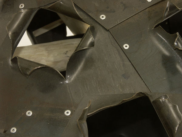 Tôle d'acier éclatée, rondins de châtaignier teints, 385 x 370 x 380 cm