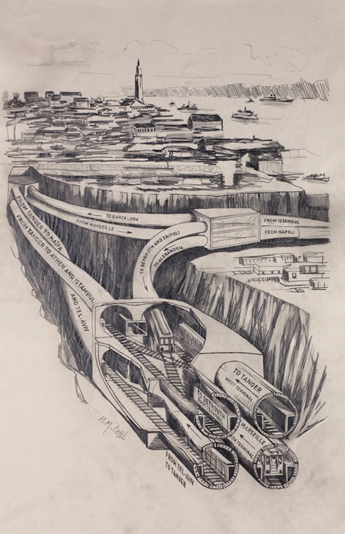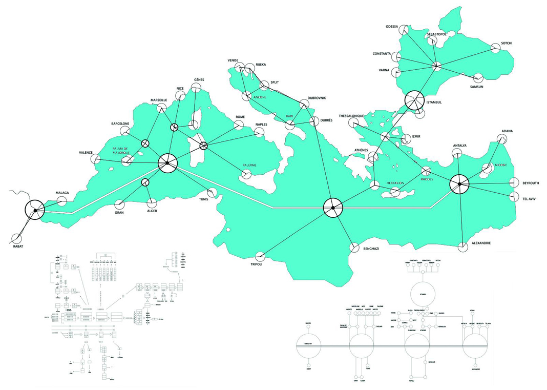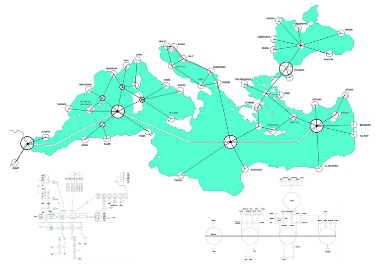 Il sera question de collecter les dépêches concernant les activités géopolitiques du monde méditerranéen de la dernière décennie, d’en produire un long «étant donné» permettant de questionner la chronologie et l’actualité des événements. Il s’agira d’en déduire des schémas organisationnels pour constituer la carte et les principes de ce réseau, d’en déduire les incidences et les usages et d’en déterminer l’impact environnemental et humain dans l’hypothèse de constructions off-shore aux points de convergence et de correspondance du réseau de transport. Nous étudierons notamment comment les réseaux ont créé les villes et comment les infrastructures répondent aux variations des besoins et des usages ; ceci s’effectuera en analysant différentes propositions émergentes dans l’art contemporain et les incidences de leurs rapports à l’espace.