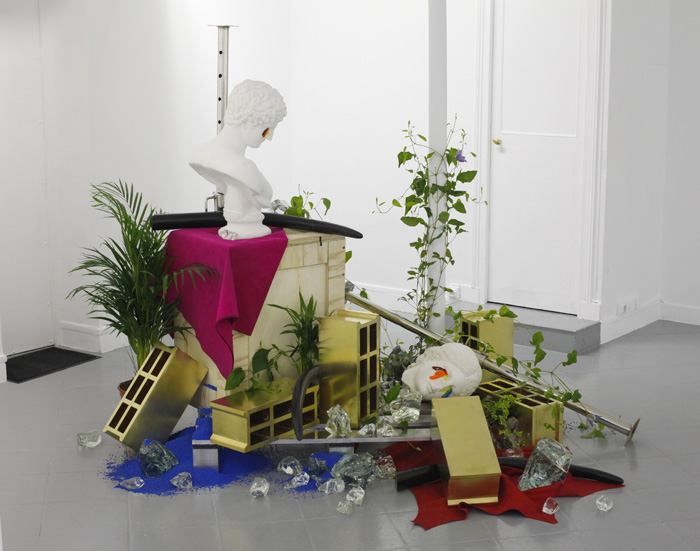Parpaings en laiton, blocs de verre, palette en aluminium, granulés de caoutchouc, cuir, sculptures antiques en plâtre, caisse en bois, etc.