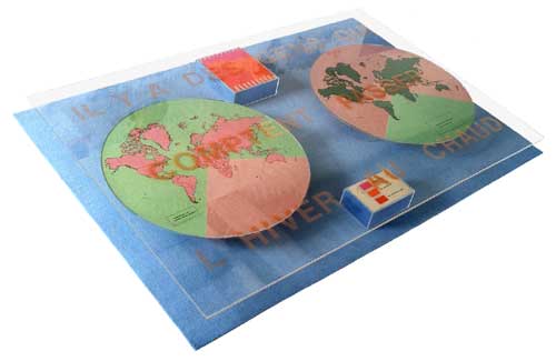 On this world map showing rainfall and currents, the original captions have been replaced by captions such as flow of frustration, flow of joy or stifling of desire and the number of days per year they appear. A distance is produced between the rationality of the method and the subjectivity of the observed elements . The resulting discrepancy transfroms feelings such as desire or frustration into the ungraspable subject matter of a hypothetical, scientific and quantifiable objective analysis.
