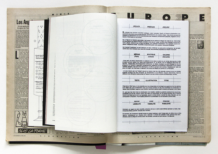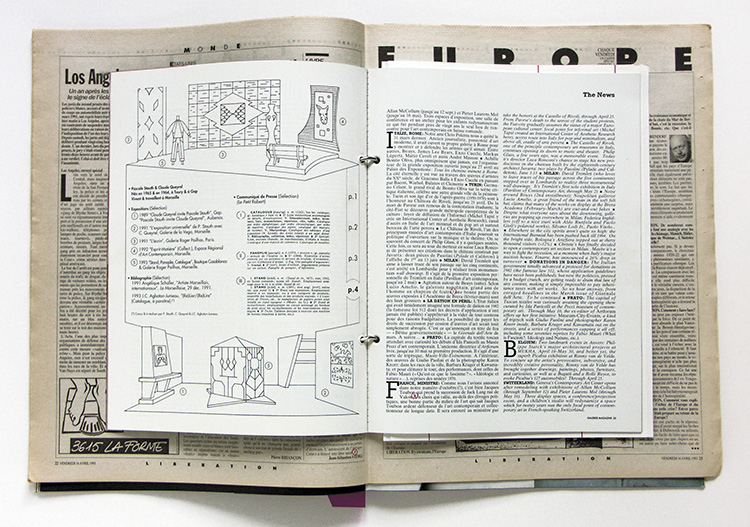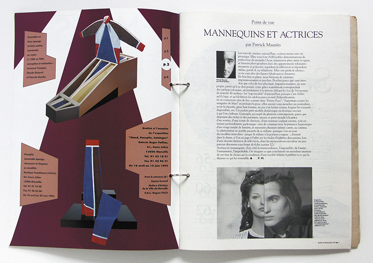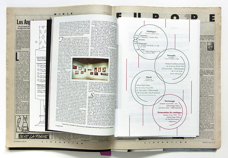 Ce catalogue réunit les différents journaux dans lesquels sont parues ses pages : Libération, vendredi 16 avril 1993 ; Le Jardin des Modes n° 169, mai 1993 ; Galerie Magazine, n° 54, avril-mai 1993 ; ainsi que le carton dinvitation de la galerie.