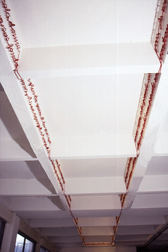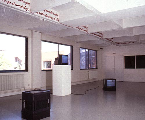 Nails, wool, 3 monitors, 3 videos, pedestal site-specific installation at the Artothèque