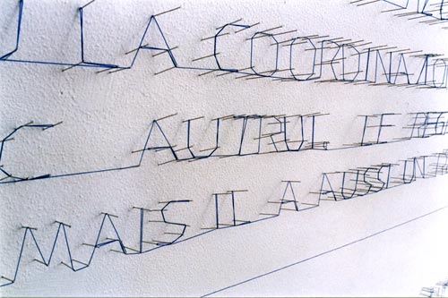 Épingles argentines, fil bleu, néons, textes